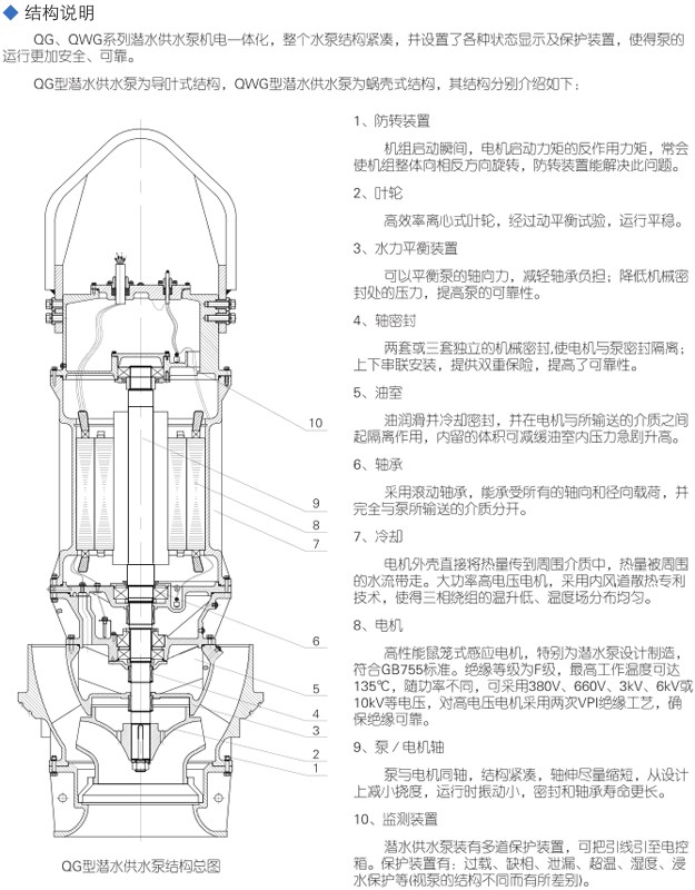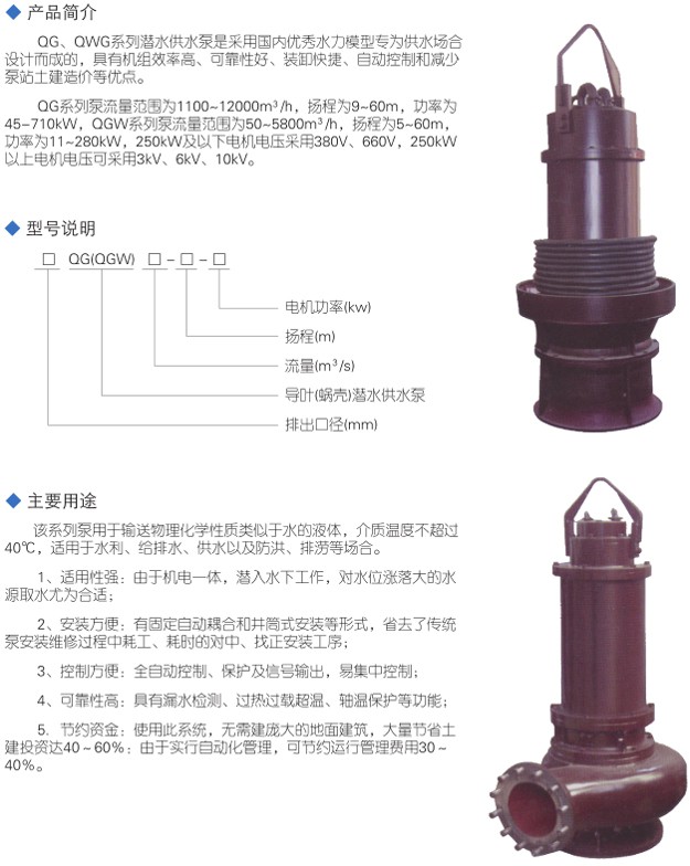 QG、QGW系列潛水供水泵具有機組效率高、可靠性好、裝卸快捷、自動控制和減少泵站土建造價等優點。QG、QGW系列潛水供水泵機電一體化,整個水泵結構緊湊,并設置了各種狀態顯示及保護裝置。使得泵的運行更加安全、可靠。QG潛水供水泵為導葉式結構。QGW潛水供水泵為蝸殼式結構。